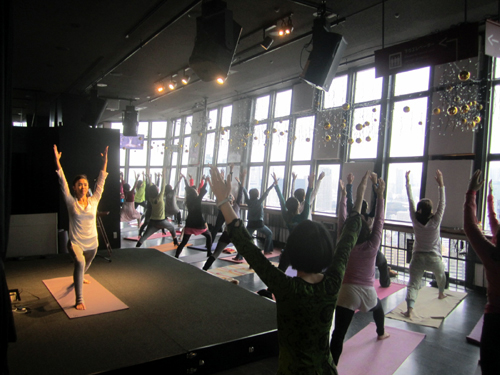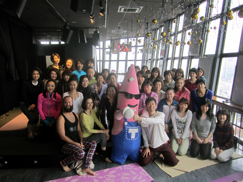 12月23日(月)に東京タワーが迎える開業55周年にちなみ、アラフォー女子55名が綿本氏による55分間のスペシャル・プログラムを受講。地上150mの展望台がリラクゼーション空間となりました。東京タワーのマスコット・キャラクター“ノッポン”(兄)やDVDにも出演しているファッション・モデルのAVI、綿本氏の友人であるカナダ出身のミュージシャン兼ヨガ講師Will Blunderfieldも出演し、賑やかな1日となりました。