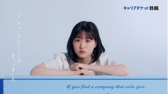 原菜乃華が登場。「自分に合う会社に出会う」ことの大切さを巨大なチケットに語りかけることで、現代の就職活動における多様な選択肢を表現しています。「客観的に誰かにオススメされた方が、意外といい会社と出会えるかもしれない」や、「就活もいろんなやり方があった方がいいと思うんです」など、就活に悩む若者のリアルな心情を、原がチケットに語りかけることでユーモラスに演じています。腹話術のように声色を変えるお茶目な様子や、真に迫る表情で訴えかける様子など、幅広い原の演技は必見です。
