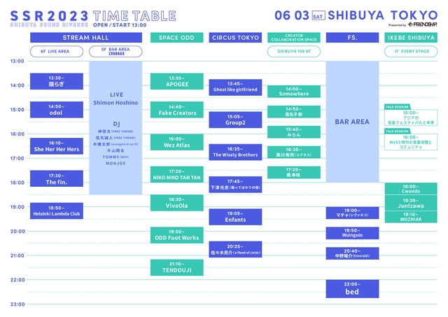 HIP LAND MUSICによる音楽ディストリビューションサービス「FRIENDSHIP.」が、渋谷川周辺エリアから新しい音楽やインタラクティブ、テクノロジーを通じたカルチャーを世界へ発信するためのイベントとして、2022年よりスタートした渋谷サーキット・イベント〈SHIBUYA SOUND RIVERSE〉(略称: SSR)の2回目となる〈SHIBUYA SOUND RIVERSE 2023〉の全出演アーティストとタイムテーブルが発表されました。