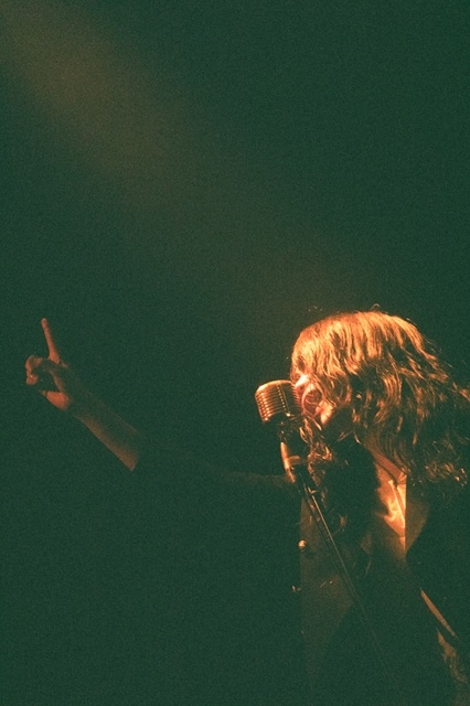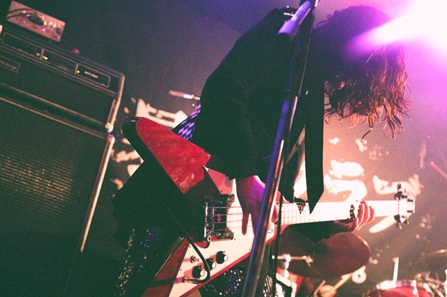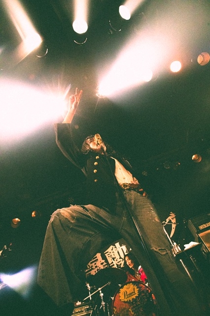 最新アルバム『暴動遊戯』のオープニング『ドライブ・ミー・トゥ・ザ・ムーン』からショーがはじまった。平均年令22才、煌びやかな衣裳とメイクから放つロックンロールのフェロモンがたちこめる。続けてインディー・デビュー・7インチシングル『暴動クラブのテーマ』、メジャー・デビュー・アルバムから『ラブジェネレーター』『ダリア』へ。チューニングのインターバルを挟み、BSよしもとでライブ映像をよく見た『くだらない時代に唾を吐け』から『Feel So Good?』まで一気に4曲、激しくも狂おしい渦を巻き起こした。チャーミングでグラマラスな佇まいに退廃的なムードが漂い、リードVoの釘屋玄が人を寄せつけない強烈なカリスマ性を放つ。日本人にはめずらしく、ブルースロックのために生まれてきたような声でワイルドにぶっきらぼうに歌う姿は、ロックンロールの悪魔と踊っているように映る。