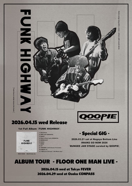 さらに、3月21日(土)には地元・名古屋今池のサーキット・イベント〈IMAIKE GO NOW 2026〉の中でQOOPIEがキュレーションするステージ「IMAIKE GO NOW “BUNGEE JAM STAGE” curated by QOOPIE」も開催。