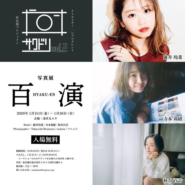 同展では、WEB番組「モクベン」から生まれた、女優になるための演劇100本ノック企画「百演」に出演する碓井玲菜(うすい・れいな / 21歳)、寺本莉緒(てらもと・りお / 18歳)、秋谷百音(あきたに・もね / 20歳)を3名のカメラマン(Takayoshi Hiranuma / tsukasa / フニャジ)が撮り下ろします。