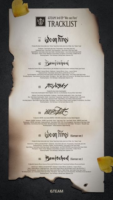 公開されたトラックリストから、1曲目にタイトル曲「We on Fire」、2曲目に「Bewitched」、3曲目に「ホットライン」、4曲目にすでに先行配信されている「桜色 Yell」が収録されていることがわかります。また5曲目には「We on Fire (Korean ver.)」、6曲目には「Bewitched (Korean ver.)」も収録されており、新譜全6曲を収録したEPとなっています。「We on Fire」のクレジットには、バッド・バニーのグラミー受賞アルバム『DeBÍ TiRAR MáSFOToS』収録曲「EL CLúB」のプロデュースを手掛けたJulia Lewis、デビュー当初から&TEAMの音楽制作に携わる