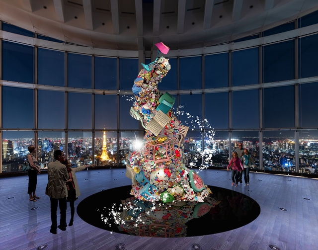 エントランス展示のイメージが初公開。増田セバスチャンが本展のために制作した、全長約6mにもなる大迫力のシンボリックアート「Unforgettable Tower」がみなさまをお出迎えします。「Unforgettable Tower」は、“記憶の積み重なり”をイメージし、サンリオキャラクターのぬいぐるみなどを使用して制作されました。海抜250mに位置する東京シティビューならではの、東京を一望できる景色と絶妙なバランスで積み重なるシンボリックアートの融合は、昔懐かしいサンリオキャラクターとの記憶を呼び起こしてくれることでしょう。さらに、エントランス展示スペースからは、東京タワーを見ることができ、「Unforgettable Tower」と東京タワーという、2つのタワーの奇跡の競演を写真に収めていただくことができるのは本展だけです。さらに、東京会場では、期間中にハロウィン、クリスマス、お正月といった季節イベントに合わせた楽しい展開も予定しています。