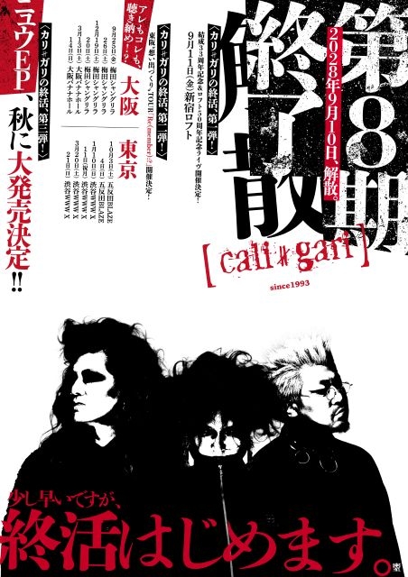 今年33周年を迎えるcali≠gariが、2028年9月10日(日)をもって第8期を終了し、解散することを発表。あわせて、解散に向けた活動を“終活”と銘打ち、2026年9月より始動することも明らかにしています。