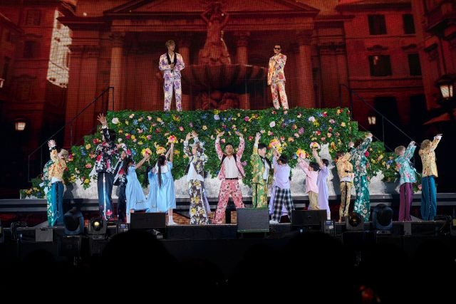 客席にカラフルなバルーンがいくつも舞い、自らのルーツでもあり、リスペクトを贈るバブルガム・ブラザーズの「WON'T BE LONG」のカバー、キュートな振りがドーム中で見られた「Ki・mi・ni・mu・chu」に続いて、本編ラストは「銀河鉄道999」だ。躍動するビートに合わせて花道でジャンプするメンバー。m-floのVERBALが現れ、完全体による「銀河鉄道999」を4万人に届けた。