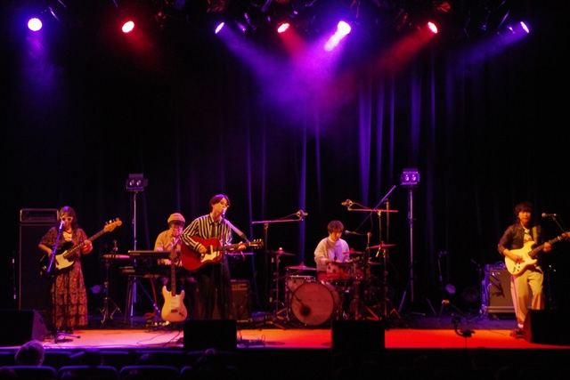 まずキンモクセイがステージに登場し、「手の鳴る方へ」でライブがスタート。イントロと共に自然と手拍子が巻き起こり、伊藤俊吾(Vo&Key)の伸びやかな歌声がバンドのアンサンブルと共に心地よく会場を満たしていく。「二人のアカボシ」「車線変更25時」では佐々木良(Gt&Cho)との圧倒的コーラスワーク、それを支える後藤秀人(Gt)と張替智広(Dr)のバンドアンサンブルで魅了し、25年のキャリアで培ったキンモクセイならではのハーモニーを響かせる。