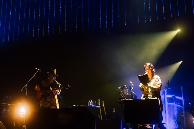 ストリングスがほのかに響く中で登場したのは、スペシャルゲストの内田也哉子。波紋のように広がっていくストリングスに相重なって「線画」が披露される。永積の儚くも凛とした歌声に掛け合うように内田は詩を朗読する。新たな表現を確立したハナレグミの楽曲体験に観客は没入する。さらに、内田のリーディングが導入となり演奏されたのは「家族の風景」。ドラマチックな楽曲の世界に内田の紡ぐ詩が加わり、ノスタルジックでハートウォーミングな雰囲気で包まれた。