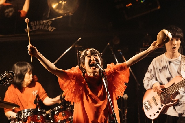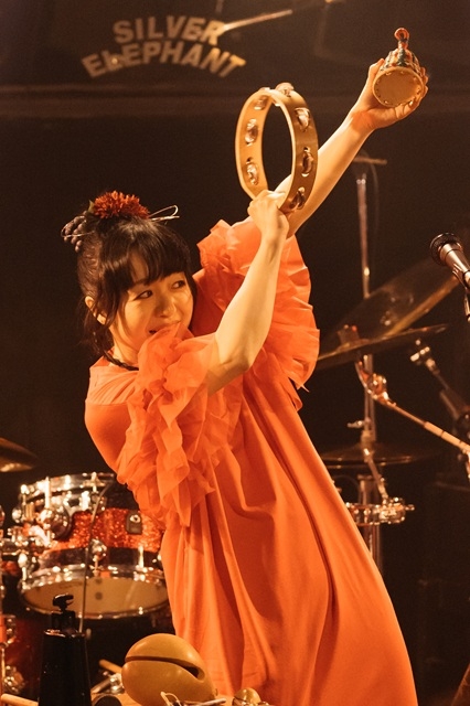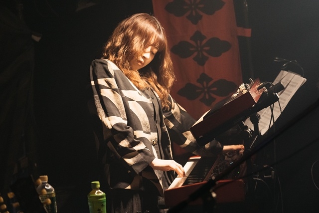 休憩からヨシダシンゴが復帰し、再びツインドラム体制に。終盤の目玉となる2曲目の新曲「八つ墓明神」が披露された。『八つ墓村』に登場する“祟り神”にして“守り神”をモチーフに、ツインドラムがメインのインスト・ナンバーを制作したのだという。演奏は、荘厳な和音の洪水に始まり、香珀のハモンドと稲益が鳴らす鉦の音が彩る中、二人のドラマーが圧倒的な競演を展開。同じパターンを重ねて叩いたり、フィルが交互に連打されたりと、情報量が多すぎて頭で追うのは難しいが、祭り囃子のようなリズムが強烈なグルーヴを生み、自然と身体が動いてしまう。突然ドラムが鳴りやみ、雰囲気が一変して幻想的なピアノソロへ。そこから再び最初のモチーフが戻ってくると、迫力は何倍にも増し、雷のような轟音が響き渡る。まるで神の怒りのようでもあり、厄払いのようでもある圧巻のサウンドで、この日のハイライトと言ってよい演奏だった。