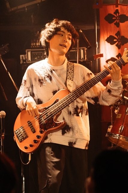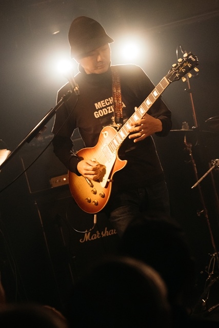 続いて、昨年夏にも披露されたマスヒロ作曲の「Van Who(仮)」を演奏。バンドの中では、異色の英国風サイケロック・ナンバーで、後藤は「バンカラ風来坊」(?)と説明していたが、実は仮題には「Van Halen + The Who」の意味が込められている。高木のウィンドミル奏法も炸裂し、70年代ハードロックの香り漂うマスヒロのドラミングとロクロウのドライブ感あるベースが冴えわたった。