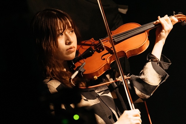 ここで高木がダブルネック・ギターに持ち替えると、昨年末リリースの『シン・武田家滅亡』からメドレーへ突入。奏でられるサイケ風のフレーズに続き、レッド・ツェッペリンの「カシミール」を思わせる重厚なリフの「新府城」でスタート。この日は香珀がヴァイオリンでインスト曲の主旋律を担当し、幻想的な音色が会場を包み込む。これは香珀の発案だったそうで、“大河ドラマ感”も一層強まった感じだ。バンド屈指の人気曲「武田家滅亡」では、激しい盛り上がりの中でロクロウとヨシダシンゴのリズム隊が鋭く決まり、滅びへ向かう武士の終焉の想いを、確かな重みとして刻んでいるようだった。