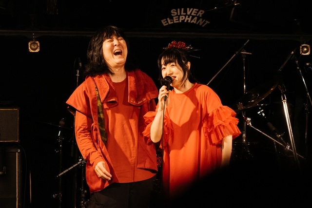 「魔少女A」は、鋼鉄感みなぎるヘヴィメタルと80年代歌謡曲の香りが同時に味わえる楽曲。特に、ヨシダシンゴの重く、アグレッシヴなドラムがサビへ向かう流れを押し上げ、歌謡調で歌い上げる「大人の女に見えても心は純のまま」をいっそう際立たせていた。香珀も冒頭から全開で、ハモンド・オルガンをはじめ多彩な音色が次々と飛び出してくる。続く「鏡の中の女」も、スイング・ジャズ風でありながら、どこか湿り気のある歌謡曲ムードをまとった曲。女の情念を描かせたら随一の横溝正史の同名小説をモチーフにしているだけあって、香珀の流麗なピアノタッチと稲益の色気あふれる歌唱の応酬からは濃密な感情が立ち上がってくるよう。
