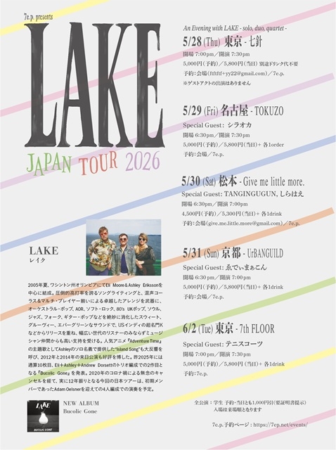 シラオカ(名古屋)、TANGINGUGUN(松本)が集結。松本はさらにシーンの俊英たちによる新バンド、しらはえも出演します。ツアー初日の東京5月28日公演はゲストアクト無しでイーライ・ムーアの各ソロ、デュオ、カルテットでの“An Evening with LAKE”が予定されています。