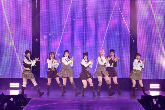4月17日に、デビュー2周年の記念日を迎え、3年目に突入してから初のステージとなった今回は、ゴールドのアクセントが映えるブラウンを基調としたクラシカルで洗練された衣装を身に纏ったメンバーが登場。ME:Iのアイデンティティを象徴する楽曲「THIS IS ME:I」で華々しくステージの幕を明けました。サビで腰を大きく反らせる“9時半ダンス”が特徴的なこの曲を、メンバーはエネルギー全開で力強く披露し、会場を一気に自分たちの色に染め上げると、MOMONAが「今日は一緒に最高の時間を作っていきましょう!」と熱く鼓舞。続く「MUSE」でも凛とした歌声を響かせ、観客の視線を釘付けに。3曲目の「Best Match」は、SNSでも話題となった、アンテナをイメージしたキャッチーな仕草が目を引く「ビビビダンス」を360度全方位へ向けて鮮やかに展開し、会場の熱気をぐっと高めました。