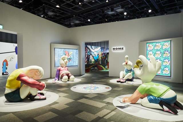 を表現しています。千賀は、立体造形の制作監修、並びに一部フィギュアの彩色を手掛けました。2.等身大フィギュアとドローイングを体感できる“HOME”個展会場の中央には、4体の等身大「FiNGA」キャラクターと、本展のために描き下ろした4枚の大型ドローイング(1,940×1,303mm)が展示された“HOME”が出現。「“情けない瞬間、ダラけている瞬間”。誰にでもある、人には見せたくない弱い部分、パーソナルな部分を見て、共感して、愛おしい存在として感じる」と語った千賀が作り上げた、唯一無二の空間です。“HOME”は高さ4m×幅9mの壁に囲まれており、外壁を彩るウォールアートも千賀が描き下ろしました。3.イチから作り上げた、オリジナル・スニーカーファッション、ストリートカルチャーを愛する千賀のもう一つのライフワークであるスニーカー制作。グループ名にちなんだ“足”に関連する創作活動として当初は既製品のリメイクから始めましたが、本展では材料を集めて一から自らの手で制作した私物スニーカー作品5点を展示します。4.個性豊かなオリジナルグッズの数々千賀健永のオリジナリティーあふれる色彩感覚を楽しめるラインナップが登場!会場内特設ショップの他、オンラインショップでもお買い求めいただけます。さらに、本展にて作品の一つとして展示されるTシャツを、“持ち帰れる作品”として展示会場限定で販売いたします。
