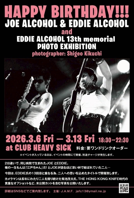 2002年に解散したロック・バンド、ザ・ホンコンナイフのメンバーだったジョー・アルコールとエディ・アルコール。2日違いで同じ病院で生まれたという、今は亡き2人の誕生日を記念し、エディ・アルコールの13回忌にもあわせた写真展「HAPPY BIRTHDAY!!! JOE ALCOHOL & EDDIE ALCOHOL and EDDIE ALCOHOL 13th memorial PHOTO EXHIBITION」が開催されます。3月6日(金)から3月13日(金)まで、東京・幡ヶ谷 club HEAVY SICKにて。入場無料(ドリンク代別)。